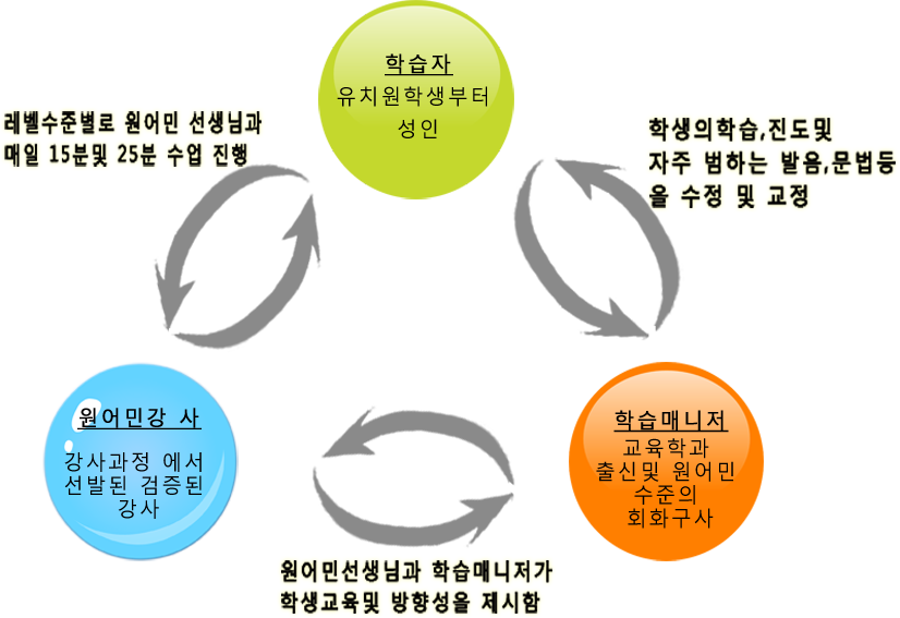 레벨 수준별로 원어민 선생님과 매일 25분 일대일 수업 -학습자 :유치원생부터 성인